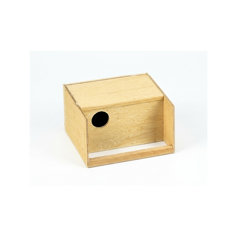 Nid boite en bois, avec perchoir devant l'entrée.